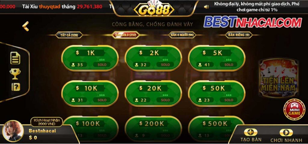 Với vinh dự lọt vào danh sách top game đánh bài online uy tín hàng đầu Việt Nam. Nhà cái GO88 đảm bảo mang đến trải nghiệm game mượt mà, ổn định, đáp ứng chiều lòng người chơi nhất có thể. Chơi game ở nhà cái GO88 bạn có thể hoàn toàn yên tâm bởi không chỏ có nhiều trò chơi mà cách chơi của mỗi game cũng rất đơn giản và dễ hiểu. Hơn hết, tỷ lệ thưởng và thắng cược tại đây rất cao.