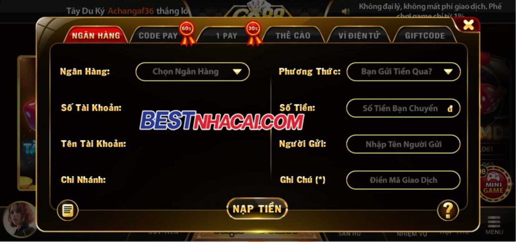 Hướng dẫn nạp tiền vào tài khoản tại GO88