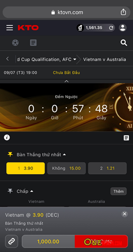 * Áp dụng với Cược Thị Trường Sớm (Trận Đấu chưa diễn ra). Trong 3 phút, sau khi cược được xác nhận.