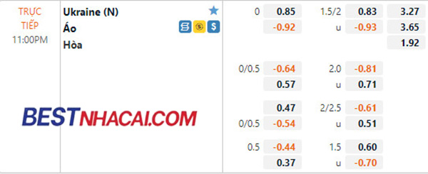 Tỉ lệ châu Á : Đồng kèo (Ukraine 0 – 0 Áo)